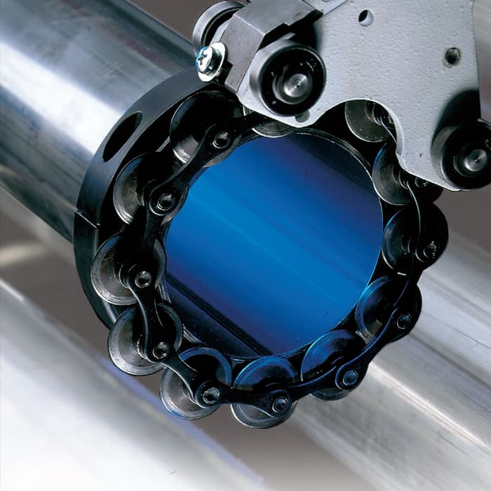 La technique de coupe brevetée du coupe-tube MRA est basée sur les manchettes spécifiques selon les diamètres et les chaînes de coupe flexibles à molettes multiples.